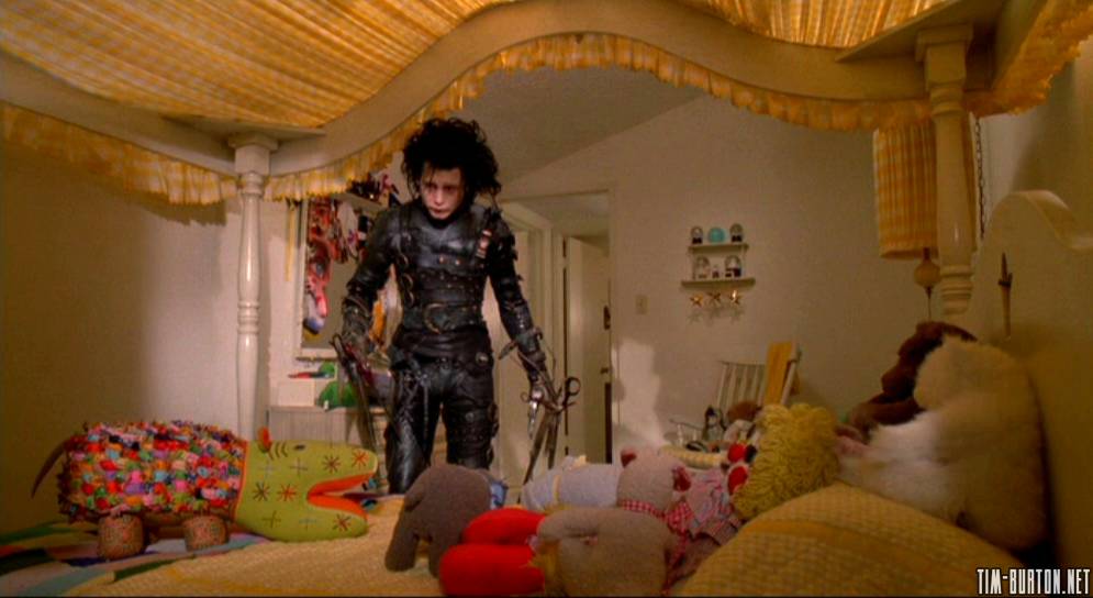Dans Edward aux Mains d’Argent, Edward se retrouve dans la chambre de Kim, encerclé de couleurs, de joie de vivre et de peluches, monde dans lequel il ne peut à priori s’intégrer, son costume noir faisant tout de suite “tâche” dans le décors.